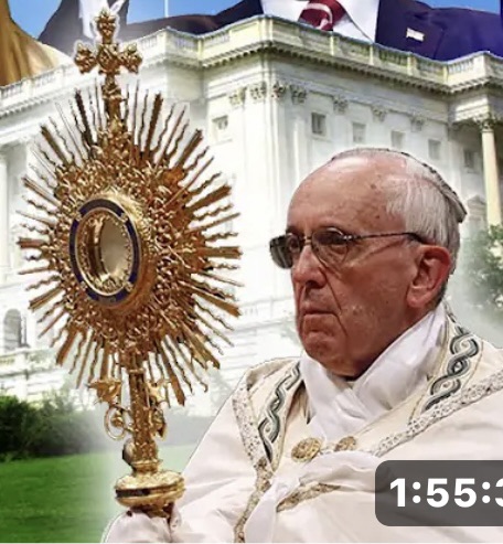 Is the Pope carrying a golden staff of the Sun with its rays flaring outward? Is it the Sun and its rays containing the Christ Sun shaped wafer looking Eucharist in the center; the unbiblical perpetual sacrifice of Christ? Hebrews 10:14